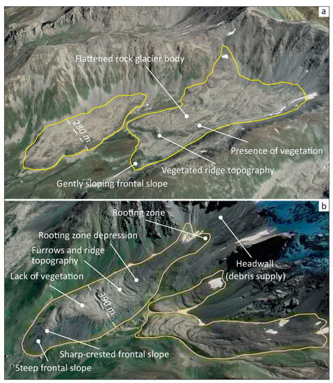 When classifying rock glaciers in their activity state, we used the morphological classification proposed by Barsch [] and developed by the International Permafrost Association (IPA) Action Group on Rock Glaciers Inventories and Kinematics []. As a result, two categories of rock glacier activity were distinguished: relict, and active (Figure 2). Despite all our efforts, morphological characteristics remain a proxy for activity and the classification remains inherently challenging and uncertain [,].