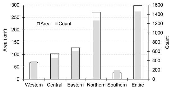 Based on the physical geographical and climatological divisions of the Greater Caucasus we divided our dataset into five geographic subregions (westerns, central, eastern, northern, and southern). The northern slopes of the Greater Caucasus contained nearly 87% of all rock glaciers from the entire mountain range, or 1267 rock glaciers with a total area of 271.7 ± 20.5 km2 (Figure 3). The number distribution by sections was inhomogeneous. The eastern Greater Caucasus contained 610 rock glaciers with the total area of 127.4 ± 9.7 km2. The central and western sections had 460 and 391 rock glaciers with a total area of 103.1 ± 8.3 and 67.4 ± 5.4 km2, respectively (Figure 3). The spatial distribution of active and relict rock glaciers for western, central, and eastern Greater Caucasus is shown on the color-coded map in Figure 4.