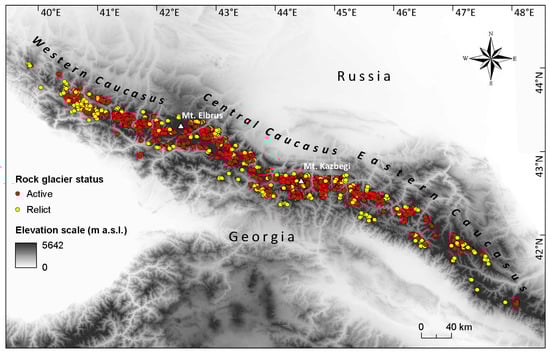 Color-coded map of active and relict rock glaciers for the Greater Caucasus.