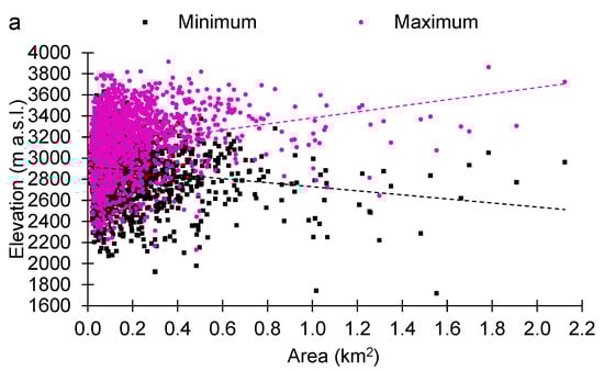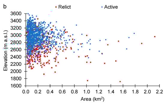 (a)—Individual rock glacier area versus maximum and minimum elevation for the entire Greater Caucasus. (b)—Individual rock glacier area versus minimum elevation (snout position) of relict and active rock glaciers for the entire Greater Caucasus.