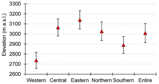 Mean average elevation of all rock glaciers inventoried across the Greater Caucasus according to the different sections (western, central, and eastern) and slopes (northern and southern). Error bars are based on standard deviation (1σ).