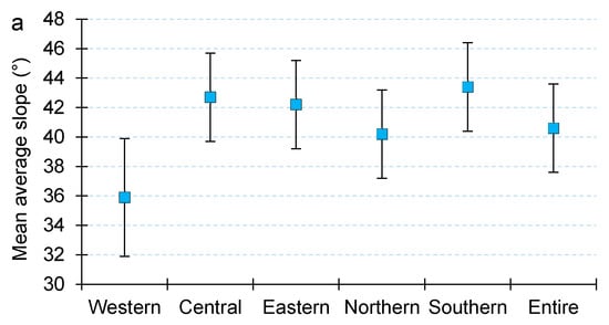 (a)—Mean average slope of all rock glaciers inventoried across the Greater Caucasus according to the different sections (western, central, and eastern) and slopes (northern and southern). Error bars are based on standard deviation (1σ). (b)—Spatial distribution of mean elevation versus average slope for all rock glaciers larger than 0.01 km2 in the Greater Caucasus.
