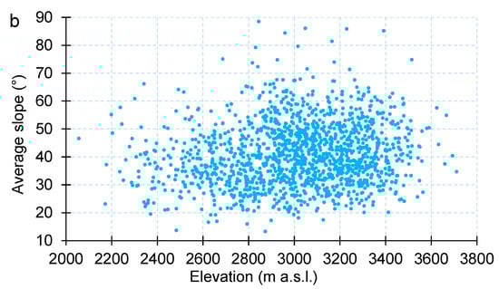 The difference between the mean average surface slope was minor between active (41.4 ± 3°) and relict (38.8 ± 4°) rock glaciers in the entire mountain region, as it is within the uncertainty. Some differences in slope were present between the different sections, e.g., rock glaciers in the western Greater Caucasus had the least inclined surface with the mean average slope of 35.9 ± 4°, while the central and eastern had relatively higher slope (42.7 ± 3° and 42.2 ± 3°, respectively). The difference in the mean average surface slope was also insignificant between southern and northern slopes. Rock glaciers found on the southern slopes had the mean average slope of 43.4 ± 3°, while the northern counterparts had the mean average slope of 40.2 ± 3° (Figure 8a). Figure 8b shows the spatial distribution of mean elevation versus average slope for all rock glaciers larger than 0.01 km2 in the Greater Caucasus.