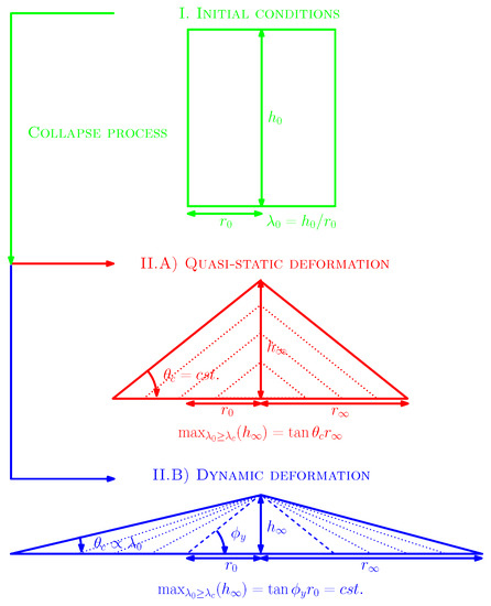 This manuscript proposes an analytical solution to the final run-out distance of the granular continuum, for which we assume quasistatic deformations, i.e., , whereas [27] proposed , i.e., dynamic deformations. These two understandings are summarised in Figure 1. In the case of quasistatic deformations, the granular pile vertically grows in proportion with , and we assumed that .