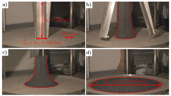 - Warnett, J.; Denissenko, P.; Thomas, P.; Kiraci, E.; Williams, M. Scalings of axisymmetric granular column collapse. Granul. Matter 2014, 16, 115–124. [Google Scholar] [CrossRef]