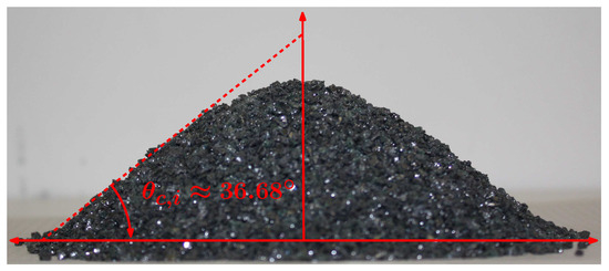 The maximum angle above which noncohesive granular material starts to flow is expressed by the angle of repose [1,2,3]. This angle is a dominant feature of such material and is stable below the critical angle. The angle varies from 25 for smooth particles to 45 for angular particles [4,5,6]. Dry sands allow for typical values of approximately 35, whereas it is much more important under wet conditions with values of approximately 90 or even greater [7]. This angle is related to the friction coefficient [8], i.e., (see [7] for further details). Other factors that influence the shape of a granular pile include gravity, grain properties (e.g., roughness, sphericity, and grain size [9,10]), the number of particles involved [11,12,13], and external perturbations such as vibrations that can cause fluidisation, leading to a relaxation stage [3].