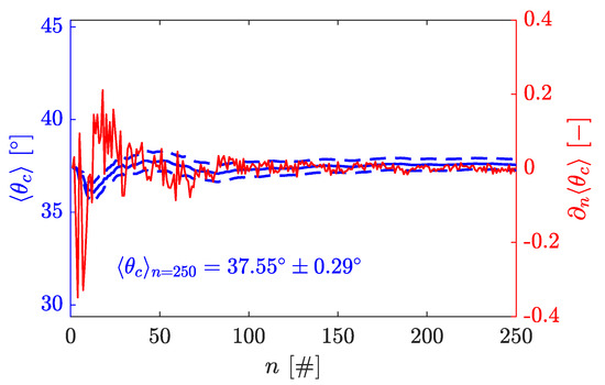 The cumulative average value of the angle of repose is shown by the solid blue line (with the dashed–dotted blue lines indicating the standard deviation of the cumulated average value), and the derivative of the cumulative average value is shown as a function of the number of measurements n.