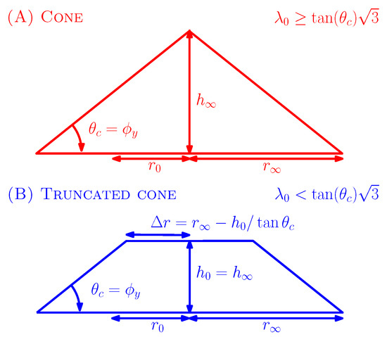 A transition phase exists, according to the initial aspect ratio, i.e., a change from a truncated cone to a cone shape [26]. References [18,19,20] proposed a power scaling law to for high and linear scaling for low . Even though such behaviour is often observed in many studies, the value of this transition remains actively discussed.