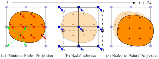 The material point method (MPM) was originally proposed by Sulsky (1994) as an extension of the particle-in-cell method. In the MPM, the weak form of the momentum equations is solved on an Eulerian background mesh. Nodal solutions are updated and then mapped to material points, which can be considered as moving Gauss points. The state variables, such as stresses or displacements, are transported by the material points as shown in Figure 6 (taken from [32]). This makes the MPM capable of handling large deformations, such as those occurring in granular flows.