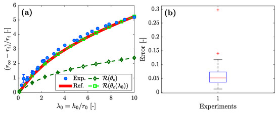 (a) Normalised final run-out distances with respect to the initial aspect ratio , with the non-dimensional unit symbol (-). The proposed analytical solution (dark green line) predicts lower normalised run-out distances when considering a quasistatic deformation of the column. When relating to , the solution (green line) is in agreement with both the experimental results (blue circles) and the solution proposed by [27] (thick red line). The (b) box plot of the errors for the experimental data demonstrates a rather skewed distribution of errors with a few outliers (red crosses). This explains the overall small amplitude of the error bars in (a).