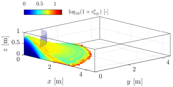 A typical numerical solution obtained with the uGIMP variant in ep2-3De v1.0 (see [34]) is shown in Figure 9. The initial aspect ratio was , and the local damping was . The granular mass spread in a realistic fashion on the bottom surface. The equivalent plastic strain highlighted intense zones of shearing. However, successive shear bands were roughly resolved because of the numerical resolution, i.e., m. One can observe that most of the plastic deformation was superficial. In addition to the overall elastoplastic deformations of the granular column, shallower granular avalanches also occurred. Few material points can be considered fully disconnected from the main body, i.e., the gaseous state observed during the experiments. Similarly, the proportion of material points in a disconnected state increased as the local damping was reduced.