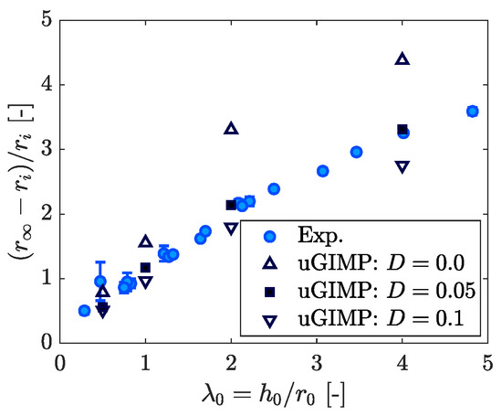 where and are material-dependent coefficients [5,25], is the initial critical aspect ratio, is the final radii of the column, and i.e., is the final run-out distance.