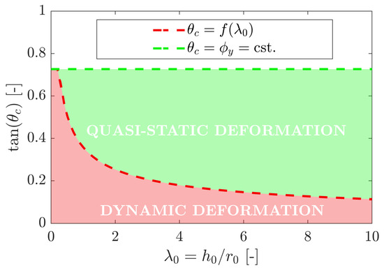 The difference between the present analytical solutions (quasistatic and dynamic hypotheses; see Figure 11) expresses an important principle under the following hypothesis. The kinetic energy loss nearly asymptotically increased during the collapse because of an increase in the elastoplastic collision rate. This suggested that the final angle of repose of a granular collapse expresses the amount of energy lost during the process, compared to a purely quasistatic deformation of the column: the greater the difference between and , the greater the kinetic energy loss is.
