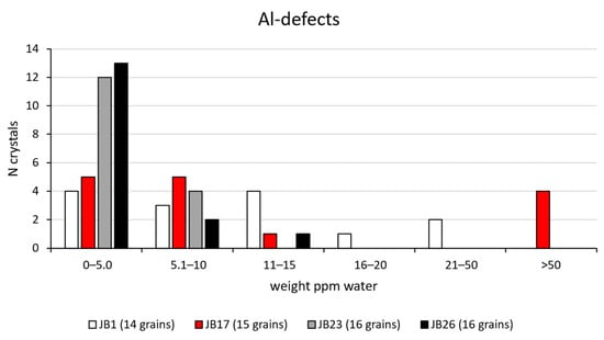 Samples JB23 and JB26 are the youngest in the stratigraphic column and are almost coeval (between 52 and 53 Ma). These two samples display very similar behaviors, with a great number of grains bearing Al defects but corresponding to low water contents, for JB23, between 0.8 and 8.8 ppm, and for JB26, between 0.8 and 13 ppm. Li-related substitutions are in the range of 0.2–0.6 ppm, in grains from JB23, and 0.2 ppm in the only grain in JB26. There are no B-related substitutions. An almost solely metamorphic origin can be suggested for these samples, according to the above-mentioned correlations [18,27].