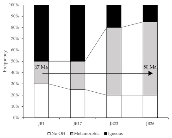 Frequencies of quartz grains from igneous and non-igneous sources from 67 to 50 Ma. As igneous quartz, we considered all grains with OH > 5 ppm according to [18,19].