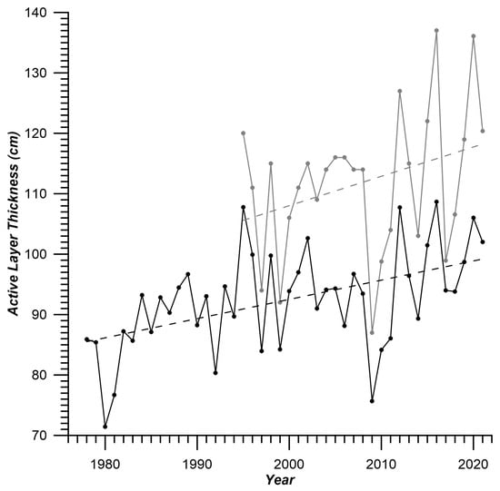 Regional active layer changes based on a weighted average from 16 landscape plots (black symbology) and observations from the CALM R3 grid (gray). Linear trend lines are shown as dashed lines in matching colors.