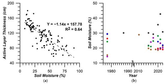 Soil moisture affects the thickness of the active layer in two ways: through changes in soil thermal properties and through latent heat associated with phase transition, the latter of which usually produces a more pronounced effect. In general, with greater ground ice content (dependent on the active layer on prewinter soil moisture content), more heat is required for the phase transition associated with the thinner active layer the following summer. Over time, changes in soil moisture, therefore, have the potential to offset active layer development and dynamics. The comparison of soil moisture data collected from dominant landscape units intermittently from 1978 to 2022 indicates that, on average, the soil moisture content has increased from 23% to 26% (Figure 5a). Well-drained polygonal tundra and sand blowouts experienced small but statistically significant drying or a decrease in soil moisture (−0.17%/year and −0.16%/year, respectively), while soil moisture in moist polygonal tundra increased (0.19%/year); the other landscapes showed no statistically significant changes.