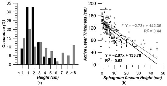 (a) The occurrence of moss of various heights in 2002 (black bars) and 2021 (gray bars) at the CALM site, and (b) scatterplot of active layer thickness and organic layer thickness (peat, mosses, and lichens) based on 121 samples taken at CALM R3 site in 2002 (black symbology) and 2021 (gray symbology).