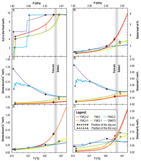 While the P-T conditions of the brucite breakdown are not influenced by the redox conditions of the system (514 °C and 1.8 GPa; Figure 1b and Figure 2), those of the antigorite breakdown are moderately influenced. Above ΔFMQ+0.7 conditions, complete antigorite consumption occurs at constant T and P (550 °C and 2.64 GPa, respectively). These P-T values are lower than those (555 °C and 2.80 GPa) under redox conditions between ΔFMQ+0.7 and ΔFMQ−1.7. Below ΔFMQ−2, antigorite is substituted by brucite as the major hydrous phase of the system. Under such P-T−fO2 conditions, the topology of the boundary between the antigorite-bearing and antigorite-free fields becomes almost parallel to that of ΔFMQ−2.