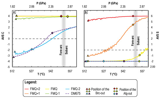 Sulfur AVS shows the opposite behaviour with respect to C. At ΔFMQ+2, even though anhydrite dissolves, the starting sulfur AVS is at ~+5.50. It reaches +6 only when antigorite is completely consumed (Figure 4b). A more extreme behaviour is observed at ΔFMQ+1 because pyrite is present under lower P-T conditions and anhydrite is present under higher P-T conditions (Figure 2). If pyrite is stable in the system (see ΔFMQ+1 path in Figure 2), its dissolution during reaction α and part of reaction β leads to a sulfur AVS of ~−1.10. As anhydrite is stabilised in the rock matrix, sulfur AVS progressively increases up to ~+5.8 at the end of the investigated P-T conditions (Figure 4b). Under the neutral and reduced conditions of the system, sulfur AVS remains constant at ~−1.98 within the whole prograde path, due to continuous pyrite dissolution (Figure 4b). However, under neutral conditions, the AVS of sulfur starts to increase near the end of reaction β, reaching ~+0.25 at the end of the investigated P-T conditions (Figure 4b).