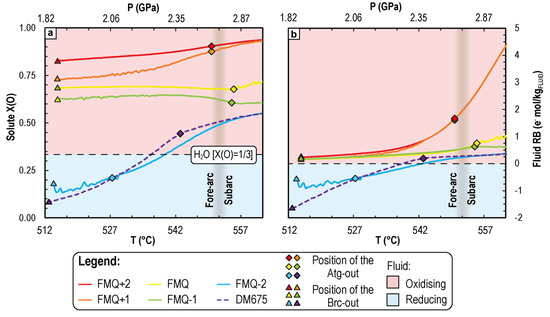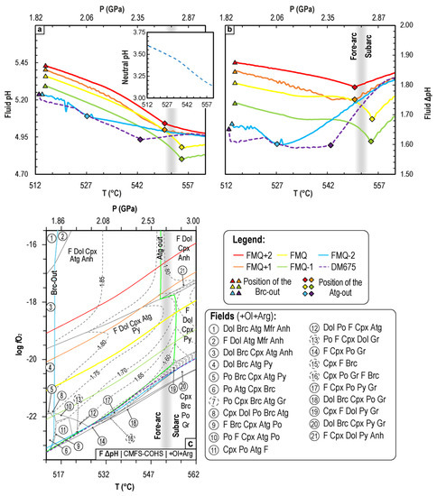 Since the pH is representative of the activity of the ions H+ (aH+) in the fluid, this value is indicative of the modifications of both the H2O activity and its ionisation constant (i.e., the equilibrium constant, which is dependent on the P-T conditions of the system and controls the auto-ionisation or auto-dissociation reaction of H2O to produce H+ and OH−; e.g., [66,67]). Both are linked to changes in the solvent capacity of the fluid. In Figure 5a, it seems that, while both reactions α and β occur, the fluid pH continues to decrease until complete antigorite consumption and then roughly remains stable for the rest of the prograde P-T path. However, due to the decrease in the neutral pH (pHNEUTRAL) value with increasing T and P (dashed light blue curve in the inset of Figure 5a), the calculated pH of the fluid is not truly indicative of the changes in the fluid solvent capacity (i.e., it is not directly known whether the fluid becomes more acidic or basic under changing P-T-fO2 conditions). Therefore, to better understand the changes in the solvent ability of H2O, the pH variation relative to neutrality (ΔpH = pH−pHNEUTRAL; [66,68]) is more informative (Figure 5b,c). The fluid is acidic if ΔpH < 0, and it is alkaline if ΔpH > 0. The positive ΔpH values (ΔpH = 1.90−1.55) indicate that the produced fluid is always alkaline, but under reduced conditions, the fluid is more acidic than under oxidised conditions.