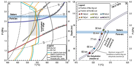 To relate such observations to subduction geodynamics, the topologies of the α and β reactions were calculated in a P-T space in which the typical P-T paths of modern subduction zones were also reported [22] (Figure 7a). Reactions α and β were calculated for (i) the original (reduced) DM675 bulk composition, characterised by carbonate+graphite+ pyrite (representative of the DM675 bulk composition at ~ΔFMQ-2; cyan continuous curve, Figure 7a; Table 1); (ii) for an oxidised DM675 bulk composition, characterised by carbonate+ anhydrite (representative of the DM675 bulk composition at ~ΔFMQ+2; orange continuous curve, Figure 7a; Table 1); and (iii) for an average composition of hydrated abyssal peridotites [41]. In Figure 7a, it is possible to assess that, in a carbonate-dominated system, reaction α is exhausted at 30–70 °C higher than in a carbonate-free system, while reaction β is exhausted at 70–110 °C lower than in a carbonate-free system (Figure 7a). The insignificant gap of ~10–15 °C between the position of reaction β calculated for an oxidised and a reduced metacarbonate sediment suggests that, for modern subductions, fO2 is less important than T and the bulk-rock composition (i.e., CaCO3-free vs. CaCO3-buffered systems). These differences in the reaction topology and in the location in the P-T space and, especially in cold subduction regimes, the proximity between the brucite and the CaCO3+antigorite dehydration reactions result in remarkable differences in the dynamics and duration of fluid release from typical serpentinites or from CaCO3-dominated lithologies belonging to the CM(F)S-COHS system. In fact, the dehydration of carbonate-free serpentinites leads to continuous fluid production, as they are subducted at forearc depths; i.e., fluid release might occur in an interval of several km of depth and of ca. 200 °C. On the contrary, antigorite-bearing metacarbonate sediments/ophicarbonate should favour a “single” pulse of fluid production and release because it occurs in an interval of a few km of depth and of an interval of ca. 10–50 °C.