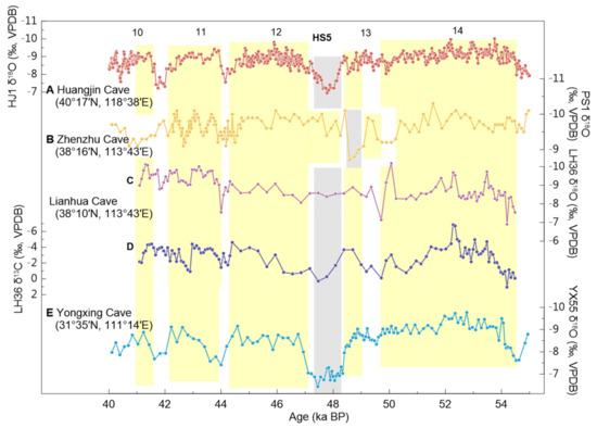 - Huang, W.; Dong, J.; Shao, Q.; Duan, F.; Wang, Y. Strong Coupling of the East Asian Summer Monsoon and Hydroclimate Footprints during 53–47 Ka. Palaeogeogr. Palaeoclim. Palaeoecol. 2022, 597, 111003. [Google Scholar] [CrossRef]