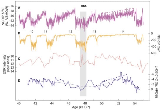 - Genty, D.; Blamart, D.; Ouahdi, R.; Gilmour, M.; Baker, A.; Jouzel, J.; Van-Exter, S. Precise Dating of Dansgaard–Oeschger Climate Oscillations in Western Europe from Stalagmite Data. Nature 2003, 421, 833–837. [Google Scholar] [CrossRef] [PubMed]