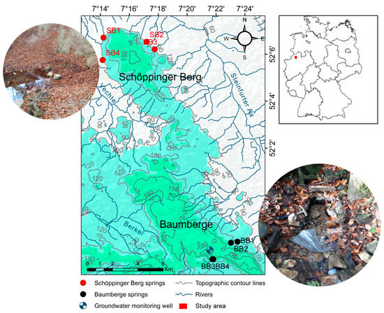 Location map of the study area. The upper right map shows Germany with border lines of its different states and the study area as a red rectangle. The main map shows the study areas with the locations of eight sampled springs in Baumberge (black dots) and Schöppinger Berg (red dots), observation well (blue dot), rivers (blue lines), selected elevation contour lines (60, 90, 120, and 150 m a.s.l), and real-world images of the two springs, Arning Ost (BB) (bottom right) and Leerbach (SB2) (upper left). Background map: SRTM DEM (The Shuttle Radar Topography Mission Digital Elevation Model; PROCESSED SRTM DATA VERSION 4.1, downloaded from CIAT-CSI SRTM website, on 20 August 2020).