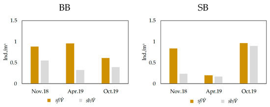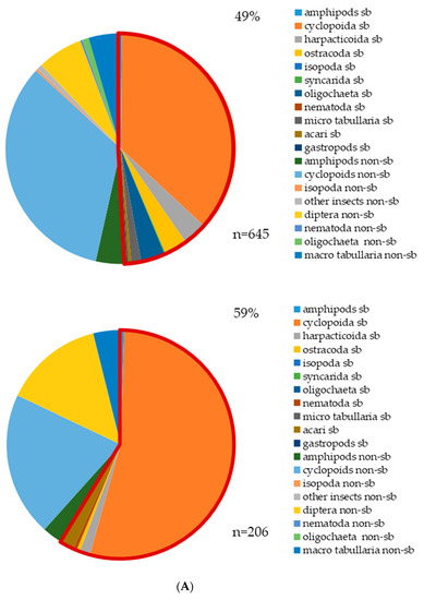 The variability of aquatic invertebrates, which consist of sb and non-sb individuals, is an indicator of the diversity of aquatic invertebrates. Comparing the two study areas, the 645 individuals of BB in total could be assigned to 17 types or species. The group of sb individuals showed nine taxa, with 49% of all aquatic invertebrates. Among the sb individuals, sb cyclopoids were the dominant group (with 237 individuals) followed by harpacticoids and ostracods, while non-sb individuals showed only eight taxa. In contrast, only 206 individuals of SB in total could be assigned to 10 species. The group of sb individuals showed six taxa with 59% of all aquatic invertebrates. The dominant sb invertebrates were cyclopoids with 111 individuals. This means that the diversity of aquatic invertebrates and sb individuals during the sampling campaigns was higher in BB than in SB, but the percentage of sb individuals was higher in SB than in BB (Figure 3A).