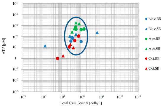 Bivariate plot showing the distribution of spring water samples along the variables of TCC and ATP for Baumberge (BB; dot) and Schöppinger Berg (SB; triangle) during the three sampling campaigns (blue: November 2018, green: April 2019, and red: October 2019).
