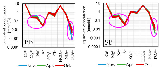 Schoeller diagram of major ions by equivalent ion concentration (mmol/L) of spring water samples, in the three sampling campaigns November 2018, April 2019, and October 2019, in four springs in Baumberge (BB; left) and four springs in Schöppinger Berg (SB; right). Pink oval refers to the ions with temporal variation.