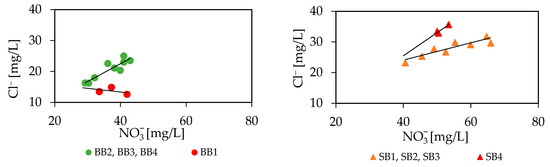 Apart from denitrification, NO3− is thought to be conservative in groundwater, the same as Cl− and bromide (Br−) [44]. Thus, the correlation between NO3− and Cl− can be informative regarding possible sources of NO3− in groundwater for BB and SB (Figure 6). In general, a positive correlation between NO3− and Cl− is significant in both areas but at different levels. In BB, the concentrations of NO3− and Cl− were lower than in SB. The variation range of Cl− was the same with 12 mg/L in both areas. In BB, one spring (BB1) showed nearly constant Cl− level with increasing NO3− concentration. This line parallel to the X-axis might be affected by denitrification [43]. In SB, one spring, SB4, showed a higher Cl− level at a similar NO3− concentration. Compared to the other springs in SB, SB4 is located in a more urban area.