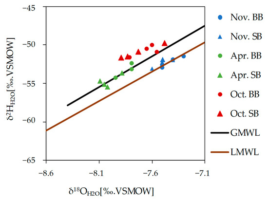 Stable isotopes of water (δ2H and δ18O (‰)) of spring water samples in Baumberge (BB; dot) and Schöppinger Berg (SB; triangle) (blue: November 2018; green: April 2019, red: October 2019), compared to the GMWL (global meteoric water line [45]) and the LMWL (local meteoric water line, Emmerich [46]).