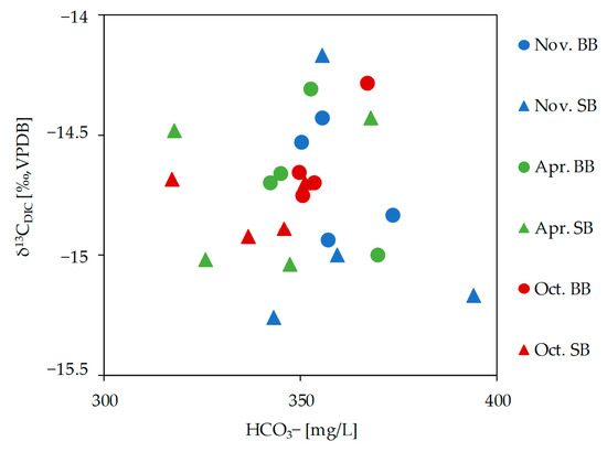 The values of δ13CDIC fluctuated within a narrow range from −15.26 to −14.17‰ with an average of −14.75 ‰ in BB, while in SB, they ranged from −15.04 to −14.43‰ with an average of −14.73‰ (Tables S1 and S2). Different sources of DIC exist in groundwater, such as atmospheric and soil CO2, oxidation of organic matter, and water–rock interactions [18]. The pH values were in the range of 7–8, which means that DIC is mainly composed of bicarbonate (HCO3−) [49,50]. The oversaturation with CO2 results in the dissolution of carbonate rocks. Figure 8 shows the relationship between HCO3− and δ13CDIC in the water samples, with no significant correlation (p = 0.7). Values of δ13CDIC in groundwater reflect the dissolution of the carbonate aquifer rocks via carbonic acid resulting from the oxidation of organic matter in the overlying soil [5].
