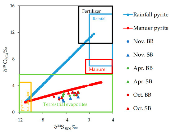 The dual isotopes δ34SSO4 and δ18OSO4 in the spring water samples from BB and SB are plotted in Figure 9. The water samples are located between the two end members of pyrite oxidation and manure [52]. According to [53], the samples of BB and SB are located in the region of terrestrial evaporites, which covers a wide range of δ34SSO4 (−15‰–+10‰). This would support the aforementioned hypothesis (dissolution of secondary gypsum) for the observed correlation in water samples from SB. However, the question is still open for the spring water samples from BB and further research is needed in this regard. Particulate organic matter residing in the groundwater zone has been identified as a main electron donor, but additional contributions from the oxidation of reduced inorganic substrates such as pyrite cannot be excluded [52,54].