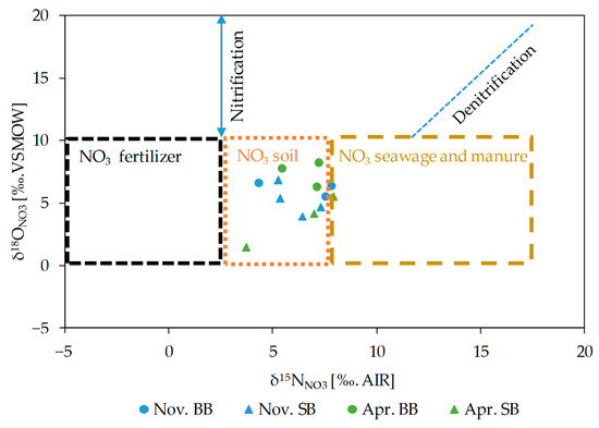 Patterns of δ15NNO3 and δ18ONO3 for spring water samples in Baumberge (BB; dot) and Schöppinger Berg (SB; triangle) in two campaigns (blue: November 2018 and green: April 2019). The diagram is modified after [58,59].