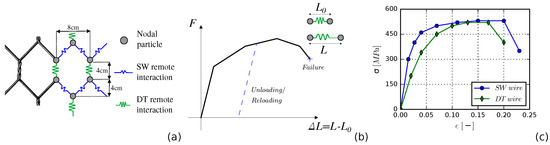 Here, an NWB approach was used for the numerical description of the mesh. This choice is based on a compromise between: (i) having a faithful representation of geometrical features of the double-twisted hexagonal wire mesh (not possible with a CB approach), and (ii) reducing the computational cost with respect to a more refined description of the mesh (CWB), without losing accuracy [31]. The wire mesh is modeled as a set of spherical particles placed at the physical nodes of the real mesh (the intersection between two wires), as shown in Figure 2a. These nodal particles concentrate the mass of the related wires and are used to handle contact with external bodies. Nodal particles are then connected by long-range interactions according to the geometrical patterns of the wires in the real mesh. These interactions virtually represent the wires and are ruled by a piece-wise linear force–displacement function in the tensile direction (referred to as the “wire” local tensile model, see Figure 2b), while compressive forces are not accounted for. The force–displacement behavior is computed from the stress–strain tensile relations. At each time step, starting with the relative distance L between the two connected particles (with respect to the initial one, ), the current elongation () is computed and used to obtain the force acting between the particles (see Figure 2b). A threshold value on the maximum elongation of a wire is used to define the failure criterion for the interactions. Different stress–strain relations (see Figure 2c) are used to describe the tensile behaviors of the single and double-twisted wires (which are taken from [46]). The validation of the mesh for this application was presented in previous works [18,19,38].
