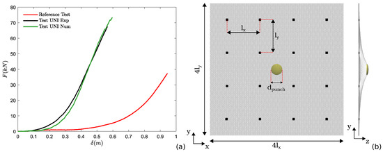 (a) Comparison of the force–displacement curve obtained from the standard UNI punch test, displaying both the experimental and numerical results, as well as in the reference configuration (Section 2.3). (b) Layout of the reference configuration.