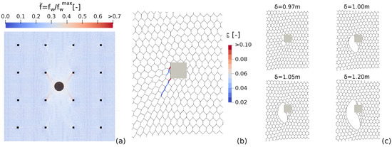 (a) Force distribution on the mesh wires an instant prior to the mesh failure. (b) Strain level on wires surrounding the upper-right anchor of the central panel. (c) Propagation of the failure in the mesh.