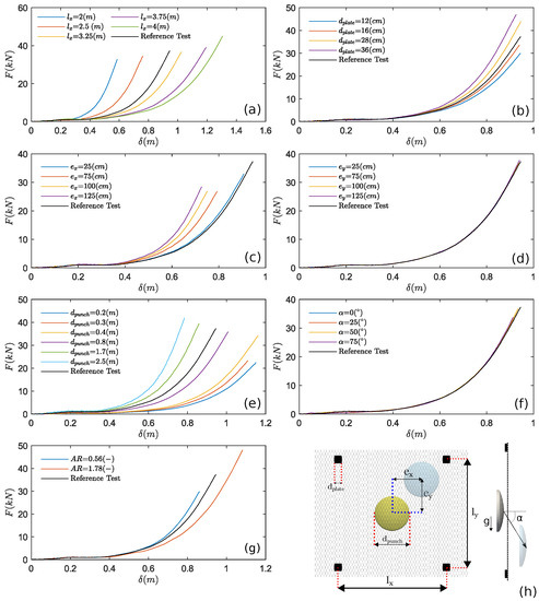 Effects of the system’s parameters on the response of the mesh system; (a) anchor spacing , (b) anchor plate dimension , (c) horizontal eccentricity , (d) vertical eccentricity , (e) punch dimension , (f) loading angle , (g) aspect ratio , (h) graphical sketch of the parameters.