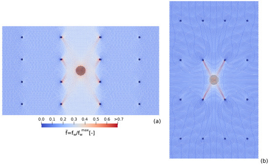 In order to better understand the “pure” effect related to the panel , we now refer to the cases with constant panel areas. These are represented by the solid red lines in Figure 6g,h. A comparison of the entire force–displacement response for three panels with different is also displayed in Figure 5g (in the panel surface of 9 m). The panel punching resistance globally increases when increasing the panel aspect ratio as well as the deflection at failure and the panel deformability. This behavior can be explained by the existence of a preferential direction for the force transmission in the hexagonal double-twisted mesh. Due to its peculiar wire pattern (hexagonal cell geometry and the presence of two wire types), the force is preferentially transmitted along the direction of the double-twisted wires [18,19] (y-direction in the present case). Adopting a panel geometry in which the vertical distance between anchor rows is reduced enhances the redistribution of the punching load on the neighboring panels. This allows for the activation of the anchors pertaining to the upper and lower panels and leads to an improvement in the retaining capacity of the system. The above-described force transmission mechanism can be appreciated in Figure 7, where the force distributions on the mesh wires for the cases and are displayed (the response is shown in Figure 5g).