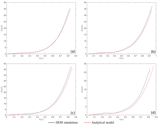 In previous works by the authors [18,19], a DEM approach was used to account for the effect of moving from standard laboratory conditions to idealized field conditions. The ideal case in which all of the mesh panels are subjected to the puncturing effect of detached blocks has been considered (this condition will be referred to as “periodic” loading conditions, in what follows). In this context, analytical relations allowing the estimation of the force and deflection at the failure of an anchored mesh panel have been proposed [34] and implemented in a simple online tool [39] to simulate the entire force–displacement response of an anchored mesh panel.