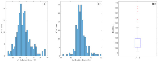 To estimate the accuracy of the analytical model in predicting the values of the force and displacement at rupture, and the whole curve, 200 additional configurations were simulated ex-post and considered as benchmarks. Each case differs from the reference configuration for the entire set of parameters, which were selected on a random basis from a uniform distribution in the range specified in Table 1; hence, scenarios that were even more divergent than the reference one were considered. The predictions of the analytical model are compared with the results from the numerical simulations in Figure 10. As indexes of the accuracy of the analytical model, we report the relative error of and and the root-mean-square error (RMSE) of the force–displacement trend. For the first two quantities, histogram plots are shown in Figure 10a,b. Referring to , 135 of the studied cases present a relative error within , 187 cases within , while the remaining are within and , with a median of and a mean of . Considering , 187 of the cases fall within , while the remaining are included within and , with a median equal to and a mean value of . In both cases, a slight right-skewed distribution can be observed (0.71 and 0.74 for and , respectively); thus, with particular reference to , a slight underestimation of the predicted value over the numerical one can be noted. To further increase the accuracy of the analytical model, the hypothesis of non-dependence among the effects of the system’s parameters should be relaxed in future studies. The RMSE is instead represented through a boxplot (Figure 10c): the central mark indicates the median and the bottom and top edges of the box indicate the 25th and 75th percentiles, respectively. The whiskers extend to the most extreme data points that are not considered outliers, which, in turn, are plotted individually using the + marker symbol. The median of the RMSE is 0.018, while the 25th and 75th percentiles are 0.011 and 0.028, respectively.