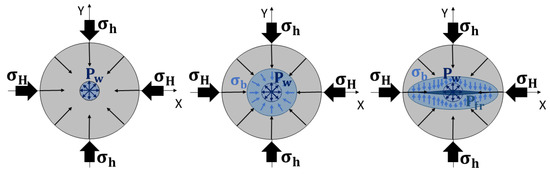 Several studies [19,40,41,42] describe recent investigations of backstress influence on the development of a hydraulic fracture. In these studies, the concept of backstress is presented as additional compressive stress acting to close the fracture by increasing the pore pressure of the fluid in the vicinity of the hydraulic fracture. This additional stress appears in the fractured formation due to the filtration of fracturing fluid from the closed fracture into the near wellbore region. The circular layer around the well on which the backstress effect is acting can be quite thin (Figure 4). The analysis of its size and evolution during fluid filtration deserves specific study. However, in this study, we assume that all the estimations are made in this thin area.