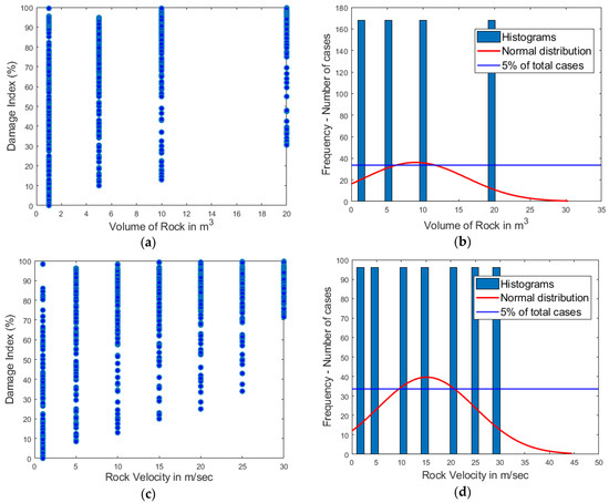 Histograms and scatter plots of the used input and output parameters of the database: (a,b) volume of rock; (c,d) rock velocity; (e,f) thickness of masonry wall; (g,h) masonry tensile strength; (i,j) damage index.