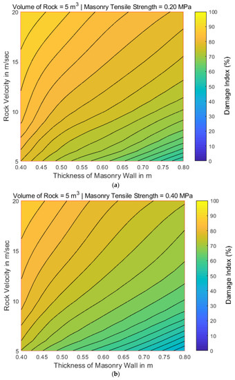 For the development of the damage database, which is presented in detail in Section 4, walls of 3 m height with 6 m length, with width varying between 0.40 m and 1 m, and blocks of 1 m3 to 20 m3, with velocities ranging from 1 m/s to 30 m/s were considered. The homogenized material mechanical properties are calculated according to Eurocode 6 and specifically § 3.6.2.3 for the compressive strength and § 3.6.3 for the wall tensile strength [42], for stone units and general-purpose mortar.