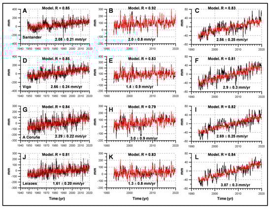 Considering the period 1948–2019, with the only exception of Gibraltar, all tide gauges showed positive trends ranging from 0.59 ± 0.16 (Arrecife) to 2.29 ± 0.22 mm/yr (A Coruña). For the period 1993–2019, most tide gauges showed, as expected, positive trends that ranged between 1.3 ± 0.8 mm/yr (Leixoes) and 4.7 ± 0.7 mm/yr (Tarifa and Gibraltar). The linear trends estimated from altimetry data had a lower dispersion, ranging between 2.4 ± 0.4 mm/yr at Algeciras and Ceuta, and 4.1 ± 0.4 at Málaga (note that altimetry trends at Palma were lower than altimetry trends in other locations, but they were estimated for the period 1997–2019). Initially, the sea level trend from the Vigo tide gauge presented a negative value. This negative trend was caused by a drop in sea level since 1998. This decreasing trend was not observed in nearby tide gauges, neither in altimetry data. There is another tide gauge, named Vigo II by the PSMSL, which has operated since 1993 and which had not been used initially, as it was not necessary. The sea level from Vigo II showed positive trends for the period 1998–2019, similar to what was observed in other tide gauges located in the same region. For this reason, data for Vigo after 1998 were discarded and instead reconstructed using regression on the redundant tide gauge (Vigo II). Once this period was corrected, the Vigo trend yielded a positive value for the periods 1948–2019 and 1993–2019 (see Table 1 and Table 2). Therefore, these will be the results discussed hereafter. The results from Gibraltar are also suspicious (or simply erroneous) and will not be considered for further discussion.