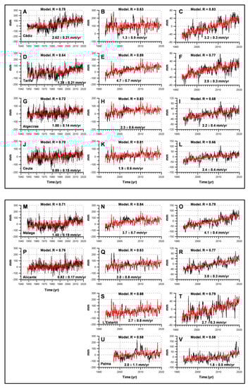 Time series of sea level anomalies for the southern Atlantic coast of the Iberian Peninsula, and the Spanish Mediterranean coast (including the Balearic Islands). Black lines show the time series of sea level anomalies and red lines show the regression on the predictors selected using the stepwise forward linear regression. Each row corresponds to a different location: Cádiz (A–C), Tarifa (D–F), Algeciras (G–I), Ceuta (J–L), Málaga (M–O), Alicante (P–R), L’Estartit (S,T) and Palma (U,V). The left, central, and right columns correspond to the tide gauge data for the period 1948–2019, tide gauge data for the period 1993–2019, and altimetry data for the period 1993–2019, respectively. Linear trends, corrected for GIA, have been inserted.