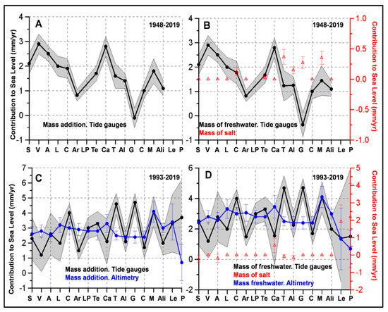 (A) shows the contribution to the sea level linear trends of the addition of mass (black lines). (B) shows the contribution to the sea level linear trends of the addition of freshwater (black line) and the mass of salt (red triangles). Both (A,B) correspond to the period 1948–2019 and the 17 tide gauges analyzed. Shaded areas and red vertical bars are the 95% confidence intervals. (C,D) show similar results for the period 1993–2019. In these cases, black lines correspond to the analysis of the 17 tide gauges, and the blue lines to the analysis of the altimetry data from the 17 grid points closest to the tide gauges. In all the cases the x-axis shows the initial of the tide gauges: Santander (S), Vigo (V), A Coruña (A), Leixoes (L), Cascais (C), Arrecife (Ar), Las Palmas (LP), Tenerife (Te), Cádiz (C), Tarifa (T), Algeciras (Al), Gibraltar (G), Ceuta (C), Málaga (M), Alicante (Ali), L’Estartir (Le), and Palma (P).